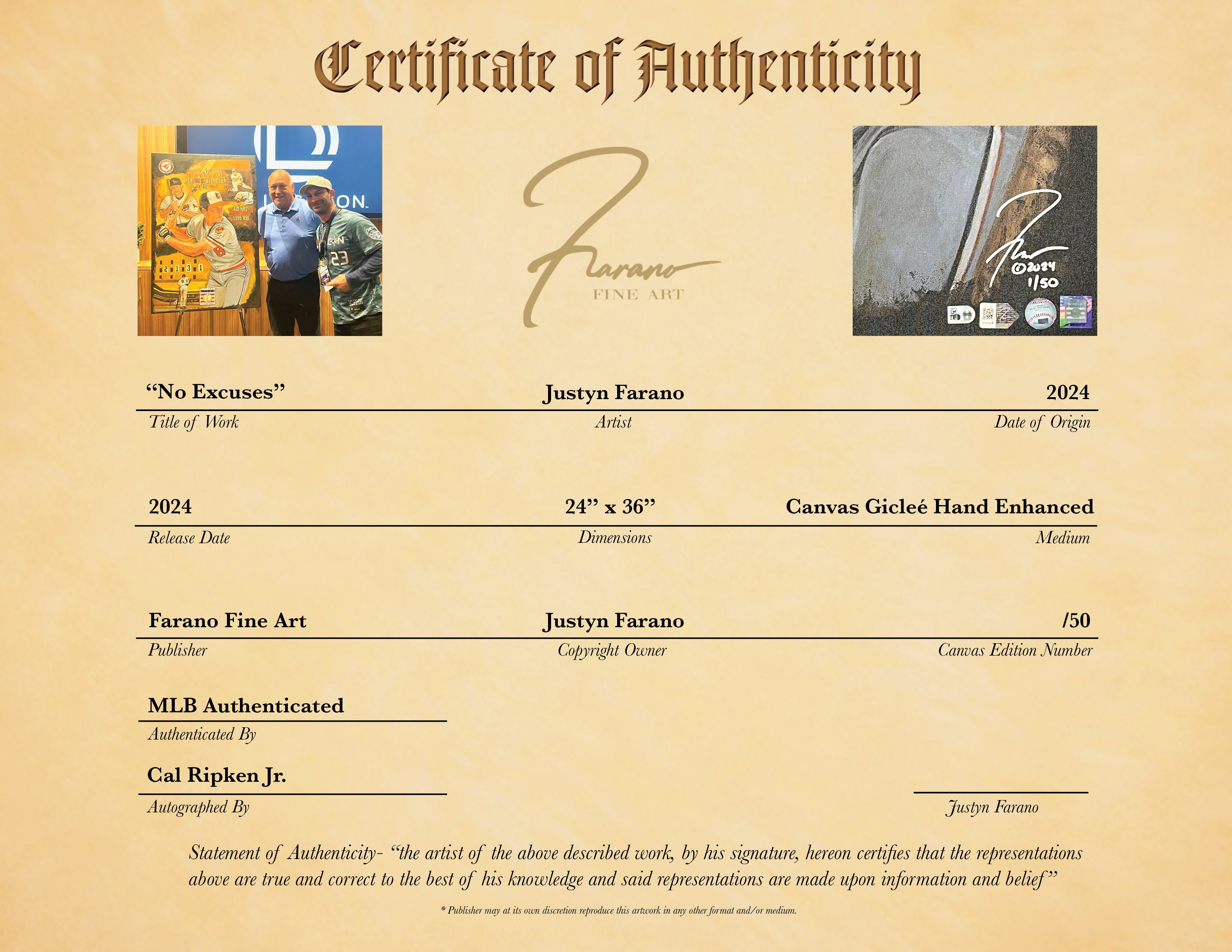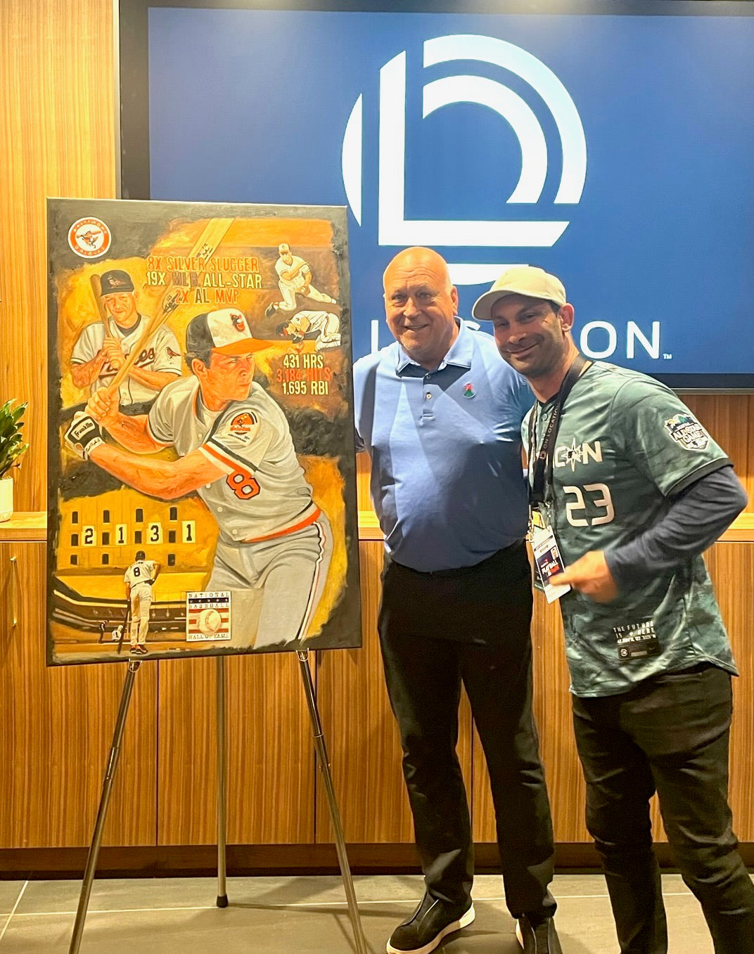 Justyn’s second painting of Ripken is a powerful nod to that legendary streak, pairing a youthful Ripken in his prime as the central image with a seasoned Ripken in the background — a visual reminder of the consistency and longevity that defined his career. The iconic “2131” banner from Camden Yards anchors the piece, celebrating the night he broke Lou Gehrig’s record. This tribute captures Ripken’s journey from rising star to enduring legend, making it a must-have for Orioles fans and collectors who appreciate the art of showing up every day.