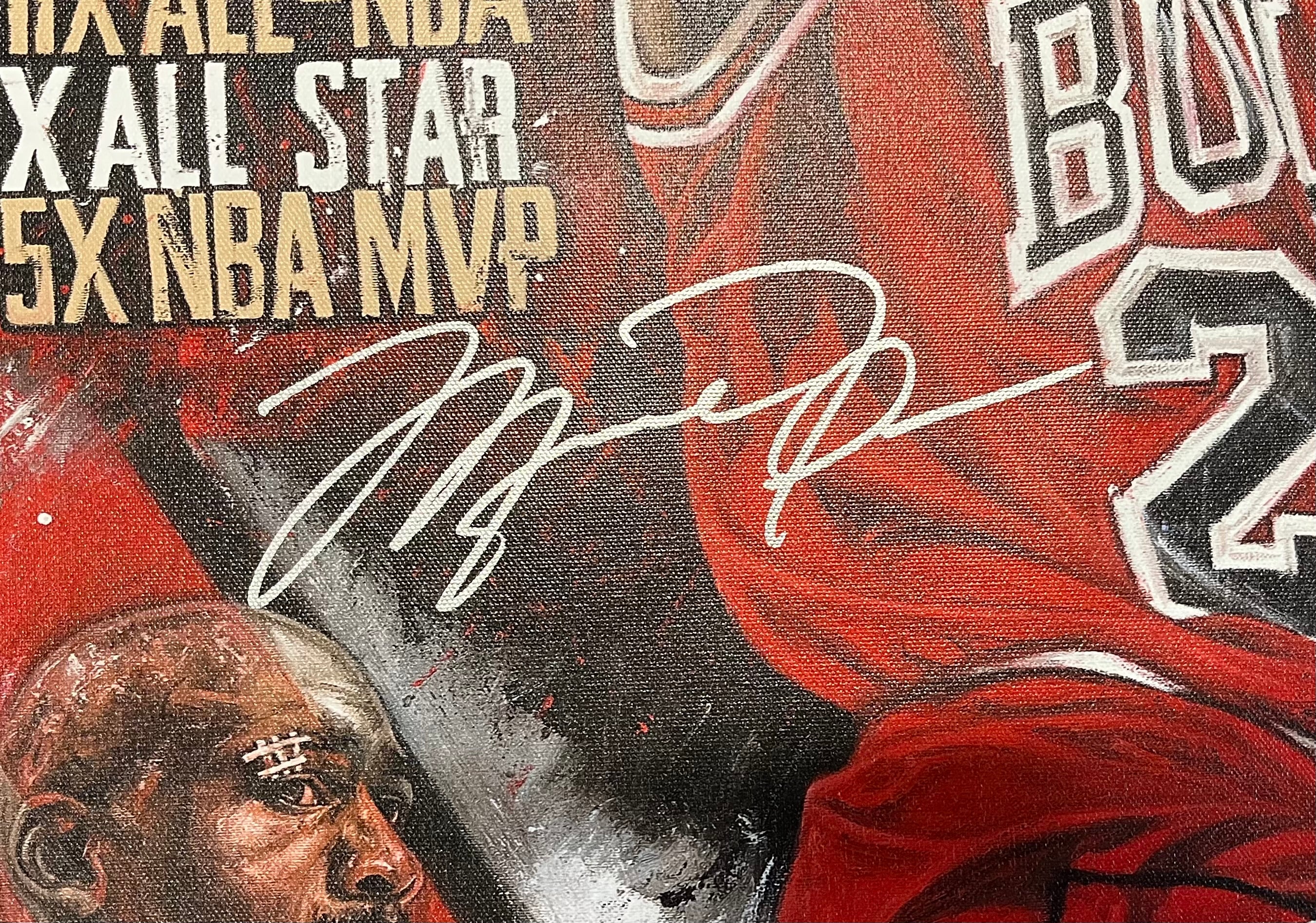 Justyn’s seventh Michael Jordan painting, Alpha, captures that raw dominance in full force. The composition explodes with energy — Jordan mid-flight, roaring with emotion, and immortalized alongside his staggering career accolades. The word “alpha” emblazoned on the piece drives home what fans already know: Jordan wasn’t just a player, he was the standard. This is the ultimate statement piece for collectors who believe winning isn’t everything — it’s the only thing.