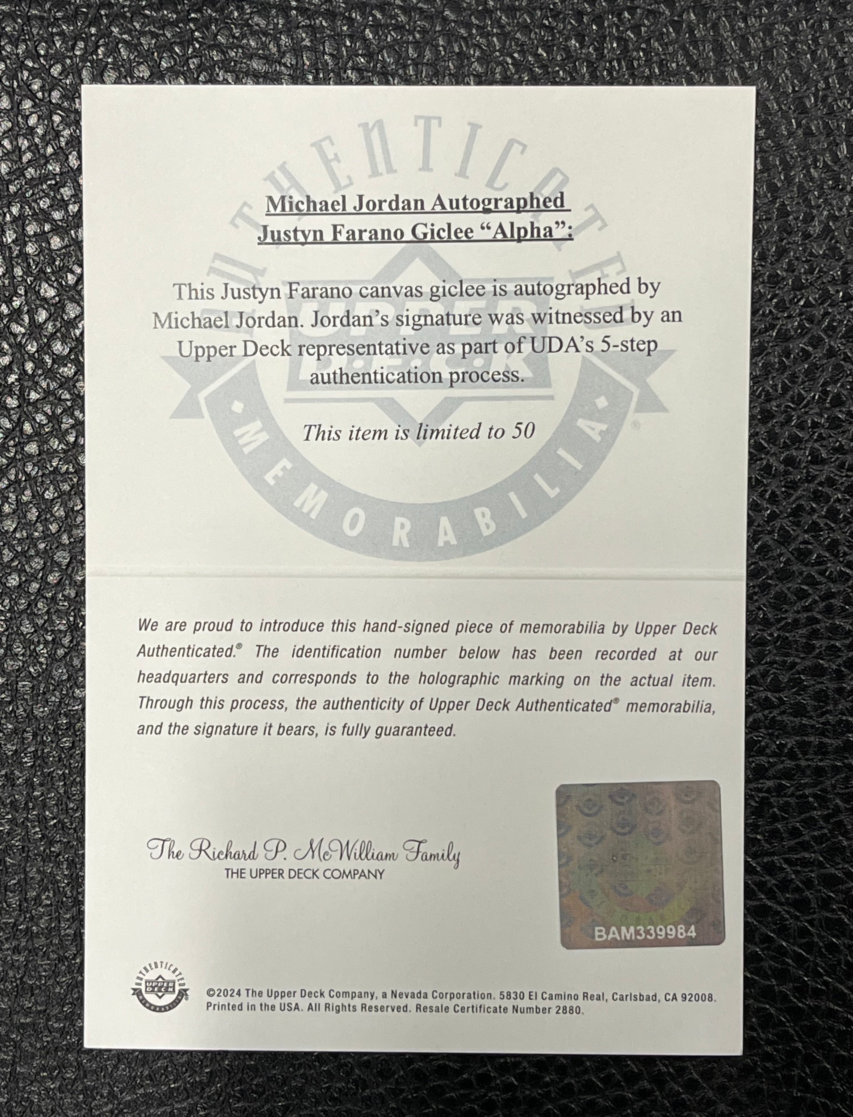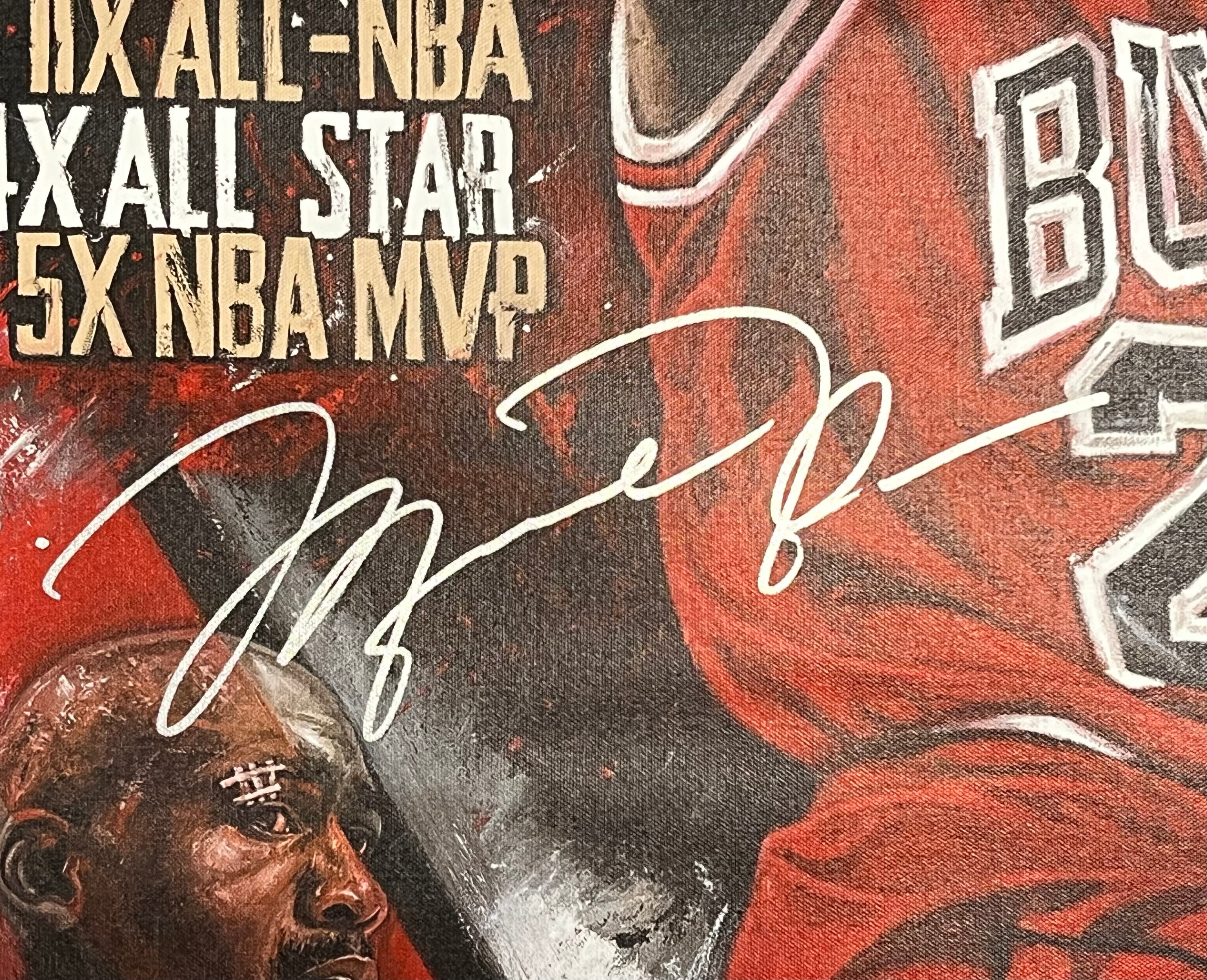 Justyn’s seventh Michael Jordan painting, Alpha, captures that raw dominance in full force. The composition explodes with energy — Jordan mid-flight, roaring with emotion, and immortalized alongside his staggering career accolades. The word “alpha” emblazoned on the piece drives home what fans already know: Jordan wasn’t just a player, he was the standard. This is the ultimate statement piece for collectors who believe winning isn’t everything — it’s the only thing.