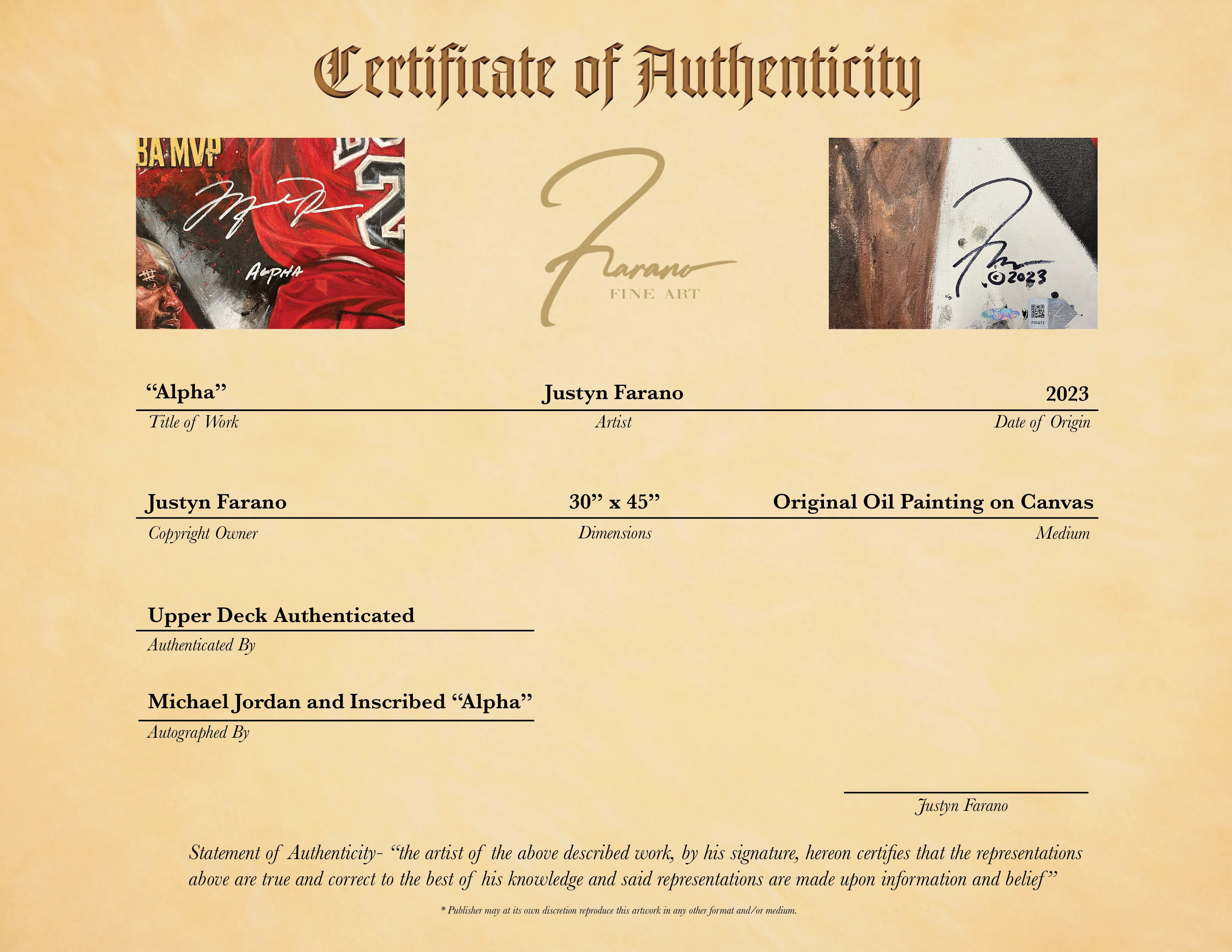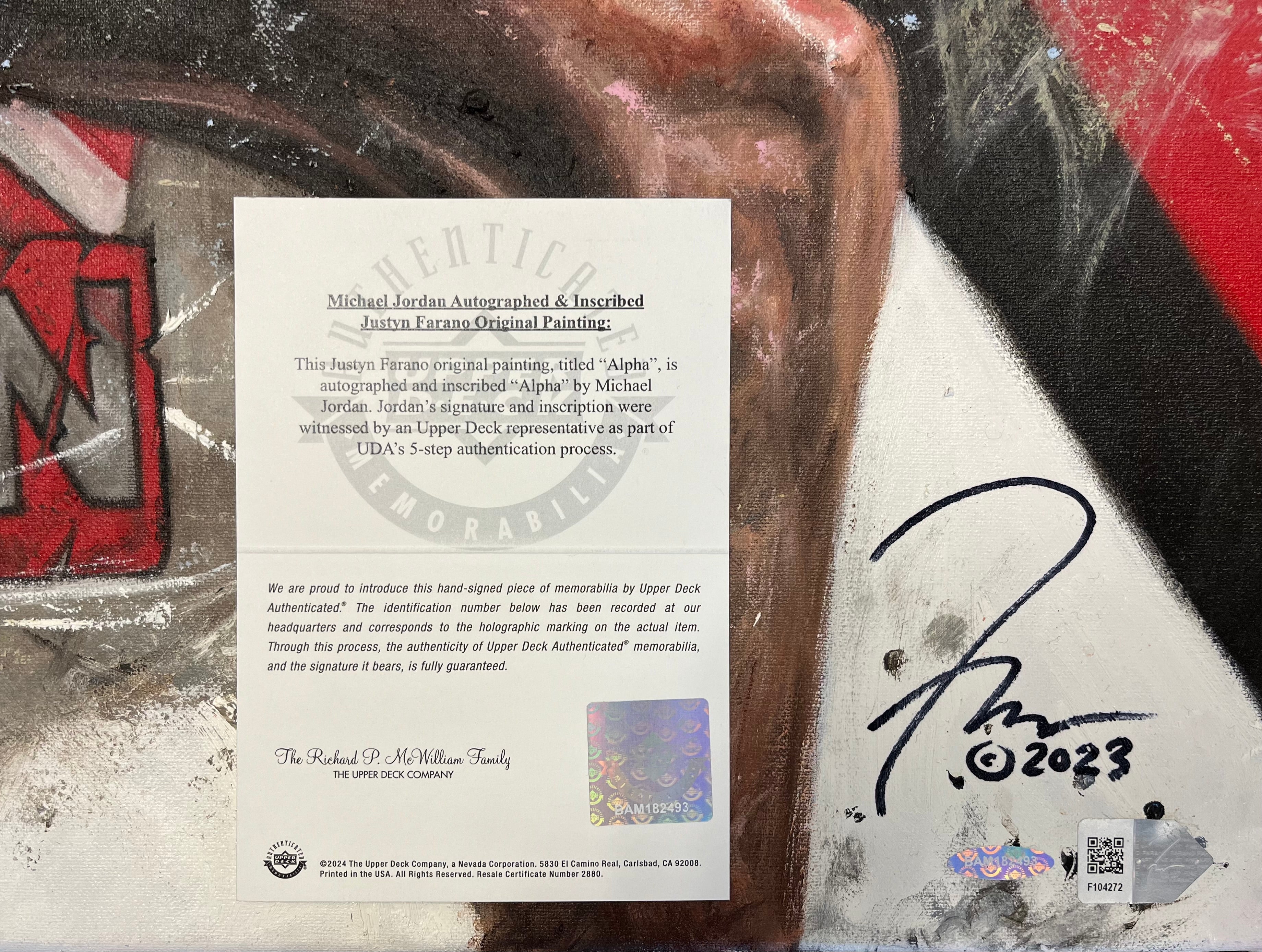 Justyn’s seventh Michael Jordan painting, Alpha, captures that raw dominance in full force. The composition explodes with energy — Jordan mid-flight, roaring with emotion, and immortalized alongside his staggering career accolades. The word “alpha” emblazoned on the piece drives home what fans already know: Jordan wasn’t just a player, he was the standard. This is the ultimate statement piece for collectors who believe winning isn’t everything — it’s the only thing.